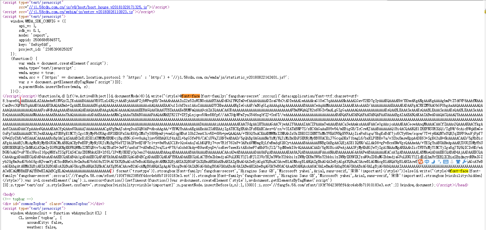 回到网页上,右键查看网页源代码,搜索font-face关键字,可以看到一大串用base64加密的字符,把这些加密字符复制下来,直接进行解密,但是解密出来的其实是乱码,这个时候其实要做的很简单,把解密后的内容保存为.ttf格式即可。
