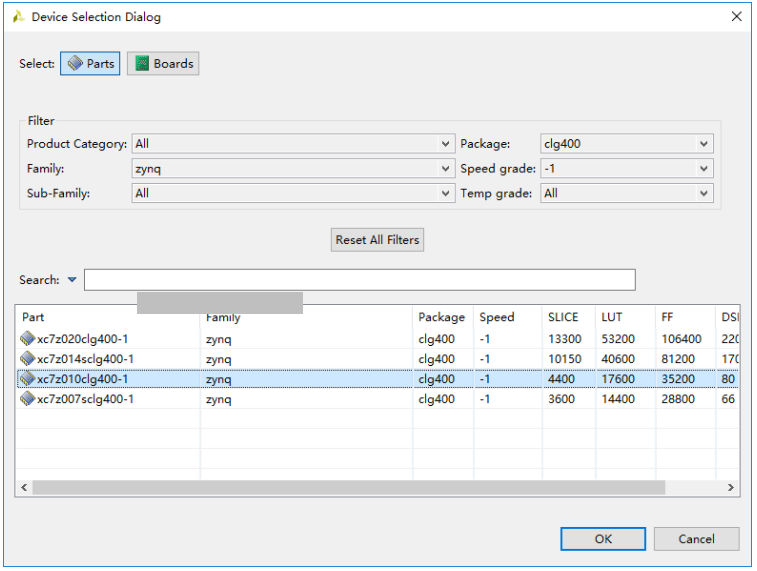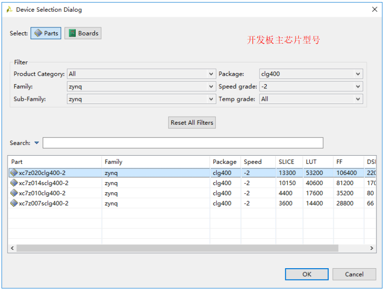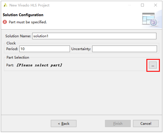 Step2:出现如下图所示界面,时钟周期Clock Period按照默认10ns,Uncertaintly和Solution Name均按照默认设置,点击红色圆圈部分选择芯片类型,然后点击OK。