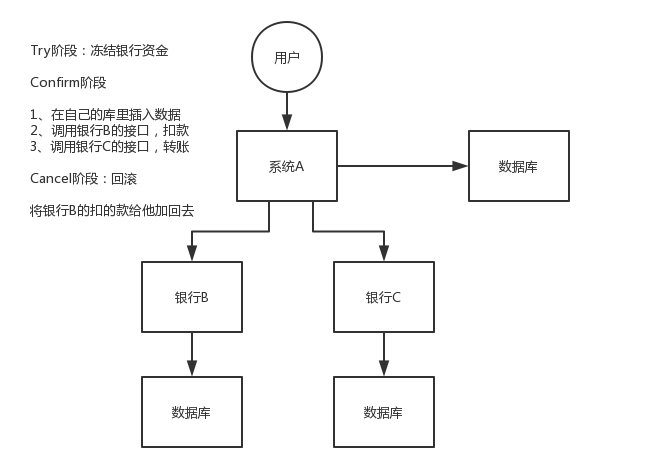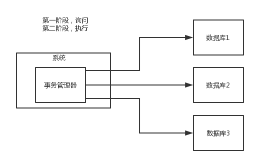 所有XA方案,就是两阶段提交,有一个事务管理器的概念,负责协调多个数据库(资源管理器)的事务,事务管理器先问问各个数据库你准备好了吗?如果每个数据库回复都ok的话,那就ok,正式提交事务,在各个数据库上执行操作,如果任何其中一个数据库回答不ok,那么就回滚事务。