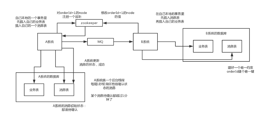 - B 系统接收到消息之后,在一个事务里,往自己本地消息表里插入一条数据,同时执行其他的业务操作,如果这个消息已经被处理过了,那么此时这个事务会回滚,这样保证不会重复处理消息;