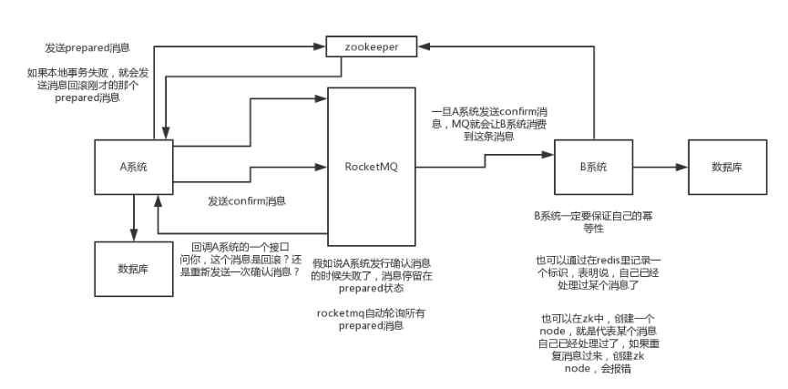 - mq 会自动定时轮询所有 prepared 消息回调你的接口,问你,这个消息是不是本地事务处理失败了,所有没发送确认的消息,是继续重试还是回滚?一般来说这里你就可以查下数据库看之前本地事务是否执行,如果回滚了,那么这里也回滚吧。这个就是避免可能本地事务执行成功了,而确认消息却发送失败了。