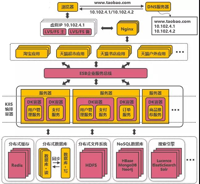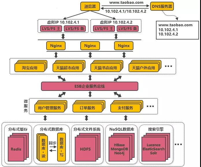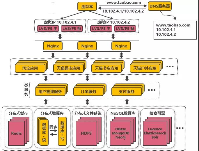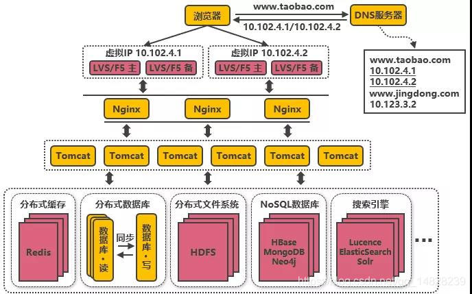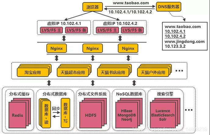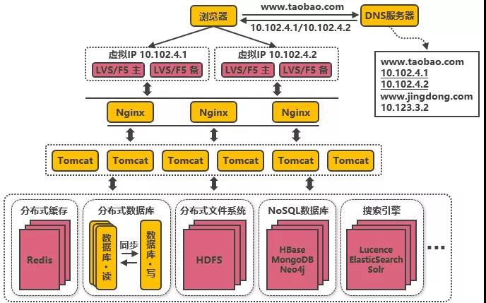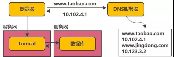 浏览器往www.taobao.com发起请求时,首先经过DNS服务器(域名系统)把域名转换为实际IP地址10.102.4.1,浏览器转而访问该IP对应的Tomcat。