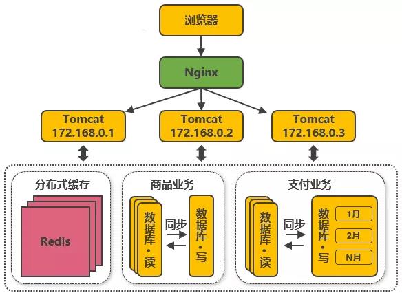 其中涉及的技术包括:Mycat,它是数据库中间件,可通过它来组织数据库的分离读写和分库分表,客户端通过它来访问下层数据库,还会涉及数据同步,数据一致性的问题。
