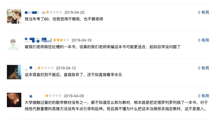 但同济大学版的《线性代数》问题就很大了,随便摘选下豆瓣的书评: