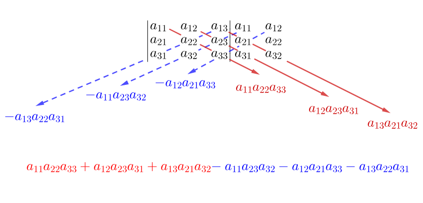 三节行列式代表了更复杂的计算方法,因为比较复杂,所以可以靠对角线法则来进行记忆: