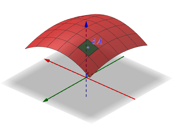 这个公式应该怎么理解呢?根据微积分的思想,可以把这个曲面切成很多小份,其中某一小份的曲面面积
