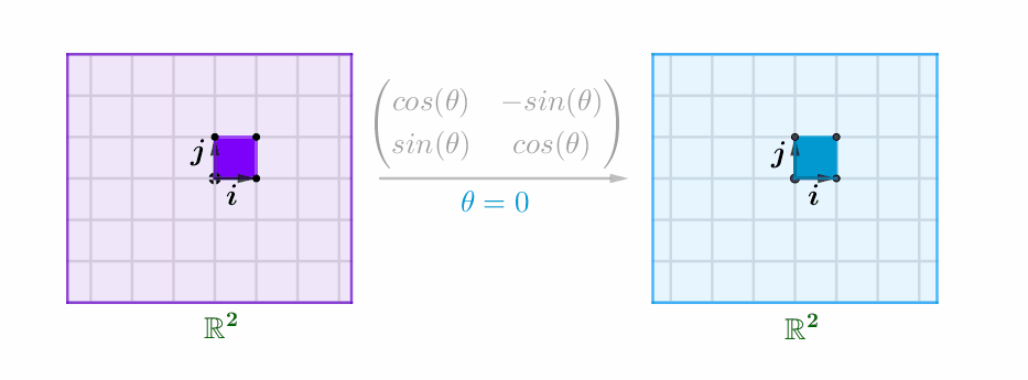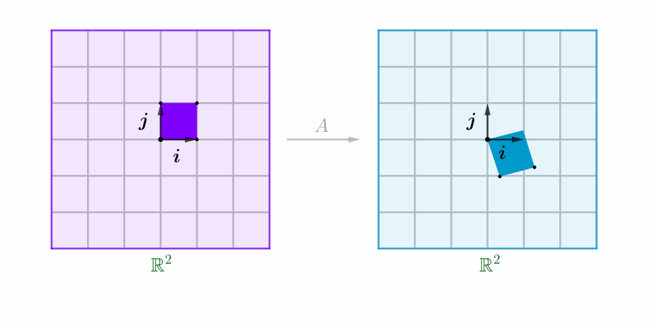 很显然旋转正方形不会导致面积改变,所以旋转矩阵变换前后的面积之比为1,或者说行列式为1: