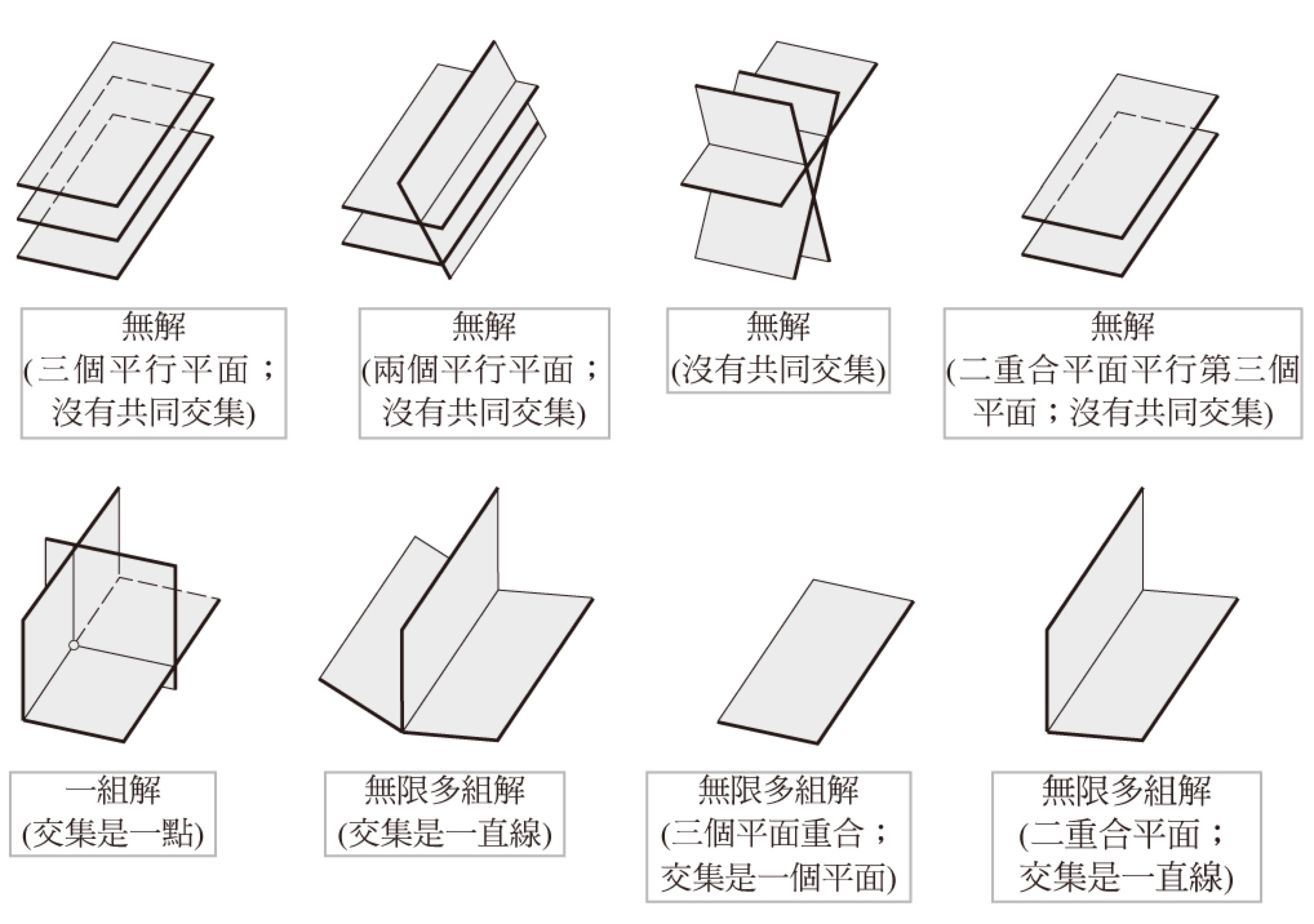 无外乎也是求这些方程所代表的平面的交点、交线、交面:
