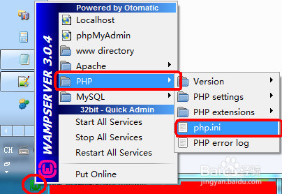 点击WAMP图标,依次选择PHP、php.ini。