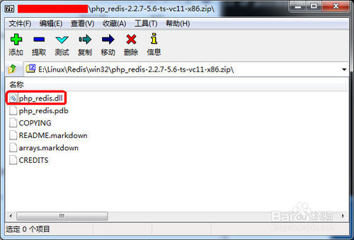 下载完成后,双击打开php_redis-2.2.7-5.6-ts-vc11-x86.zip文件。其中的php_redis.dll正是我们需要使用的php扩展。