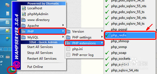 重新启动WAMP服务,并按图示确认是否正确加载了phpRedis扩展。