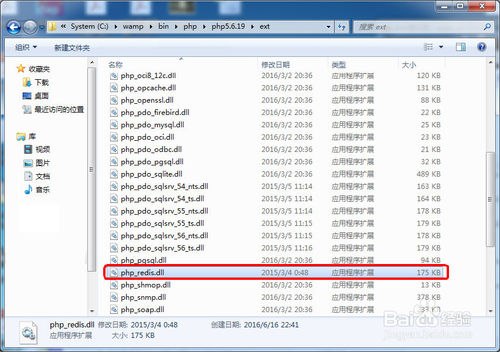 打开开发环境中PHP扩展加载的目录,这里是C:\wamp\bin\php\php5.6.19\ext。把上一步获取的php_redis.dll文件解压缩到当前目录中。