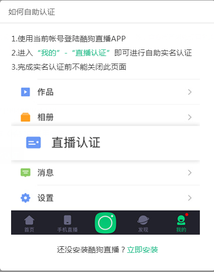 说明:如之前尚未下载过酷狗直播app,需先下载酷狗直播APP,然后登陆账号,在“我的”点击直播认证进行人脸识别