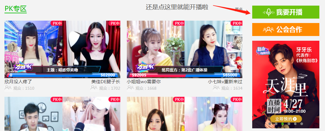 点击首页“我要开播”按钮,进行注册操作。