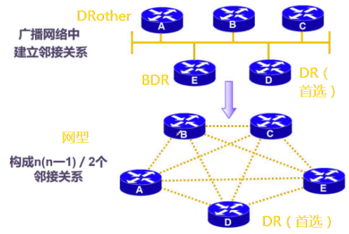 其他路由器(DRothers)只和DR及BDR形成邻接关系