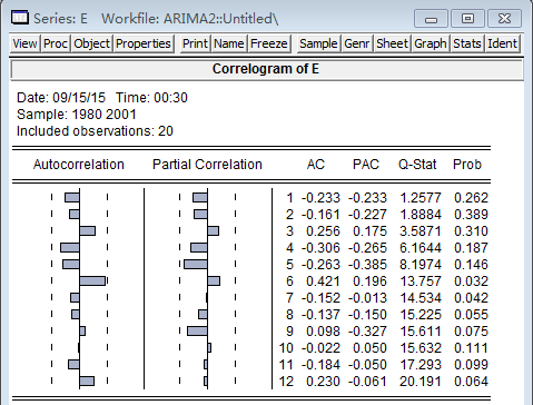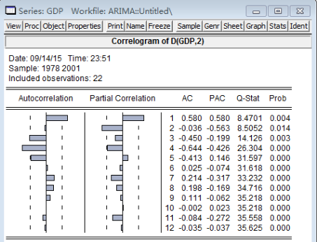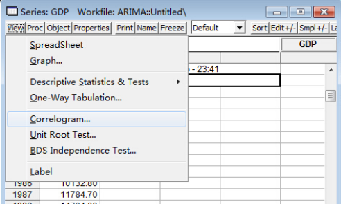 首先将GDP数据输入Eviews软件,查看其二阶差分的AC和PAC。打开GDP序列窗口,点击View按钮,出现下来菜单,选择Correlogram(相关图),如图: