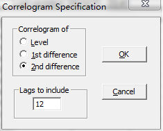 打开相关图对话框,选择二阶差分(2nd difference),点击OK,得到序列的AC和PAC。(也可以将GDP序列先进行二阶差分,然后在相关图中选择水平(Level))