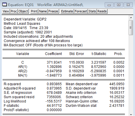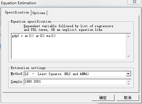 由以上分析可知,建立模型。首先将GDP序列进行二次差分,得到序列。然后在Workfile工作文件簿中新建一个方程对话框,采用列表法的方法对方程进行定义。自回归滞后项用ar表示,移动平均项用ma表示。本例中自回归项有两项,因此用ar(1)、ar(2)表示,移动平均项有一项,用ma(1)表示,如图: