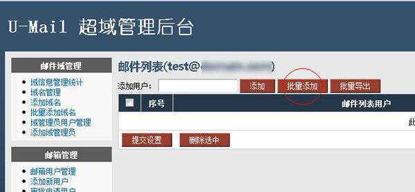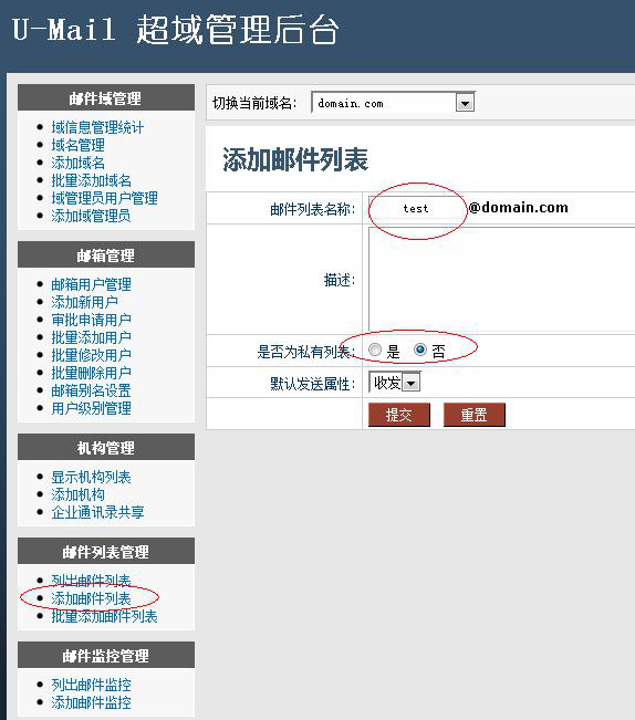 首先通过“超域管理后台---邮箱管理---邮箱用户管理”的路径,将某部门所有人员的邮箱地址都添加进来,再生成一个邮件列表中,路径为“超域管理后台---添加邮件列表”,示意图如下: