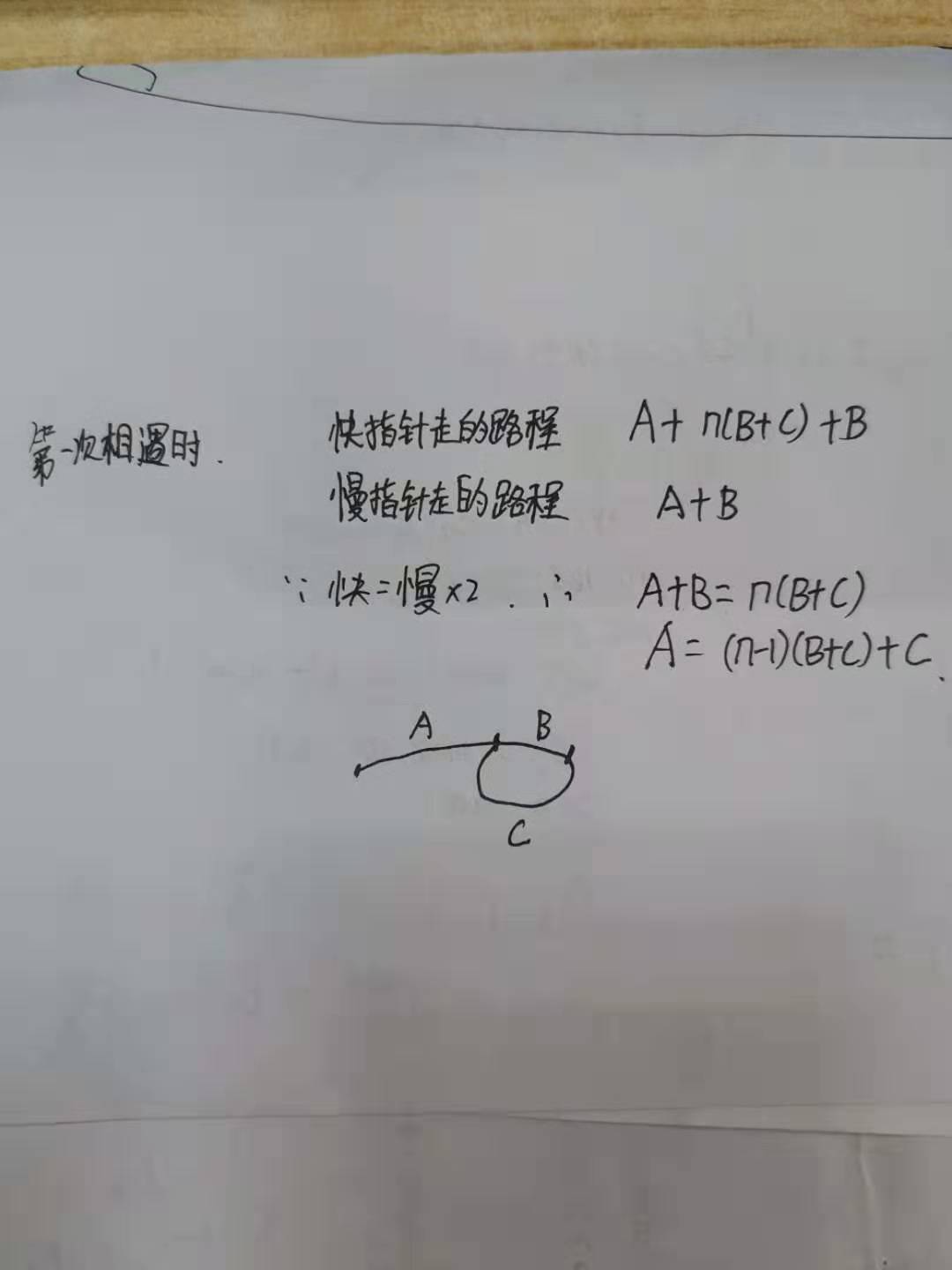2.因为快指针走过的距离一定是慢指针的二倍,所以有2(A+B) = A+n(B+C)+B。化简为A = (n-1)(B+C)+C