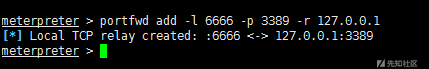 portfwd add -l 6666 -p 3389 -r 127.0.0.1 #将目标机的3389端口转发到本地6666端口