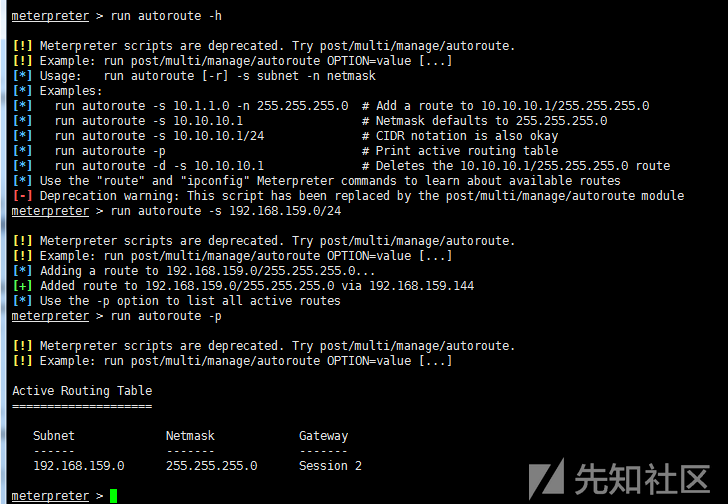 run autoroute -s 192.168.159.0/24 #添加到目标环境网络