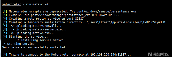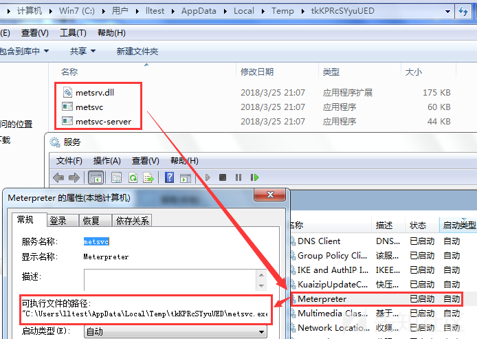 在C:\Users***\AppData\Local\Temp\上传了三个文件(metsrv.x86.dll、metsvc-server.exe、metsvc.exe),通过服务启动,服务名为meterpreter