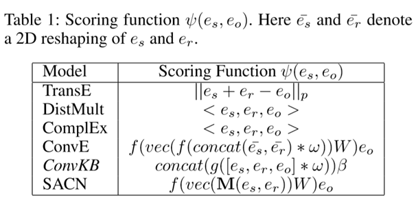 Conv-TransE这个部分类似于ConvE【2】,通过对(s, r)和o进行相似度打分,来预测关系是否成立。与ConvE的主要区别是去掉了ConvE中的reshape操作,具体可以参看文献【2】。这里给出经典的KG表征学习的打分函数。