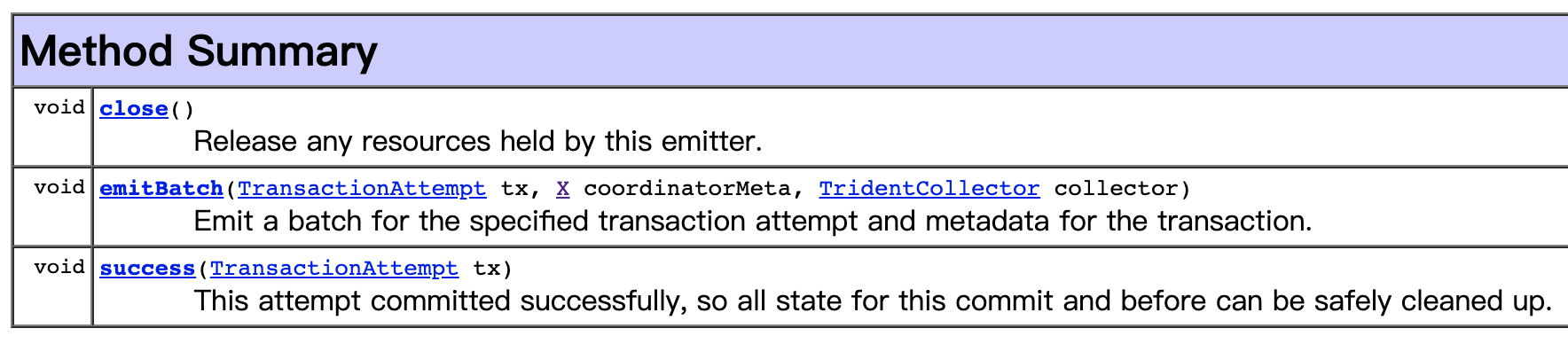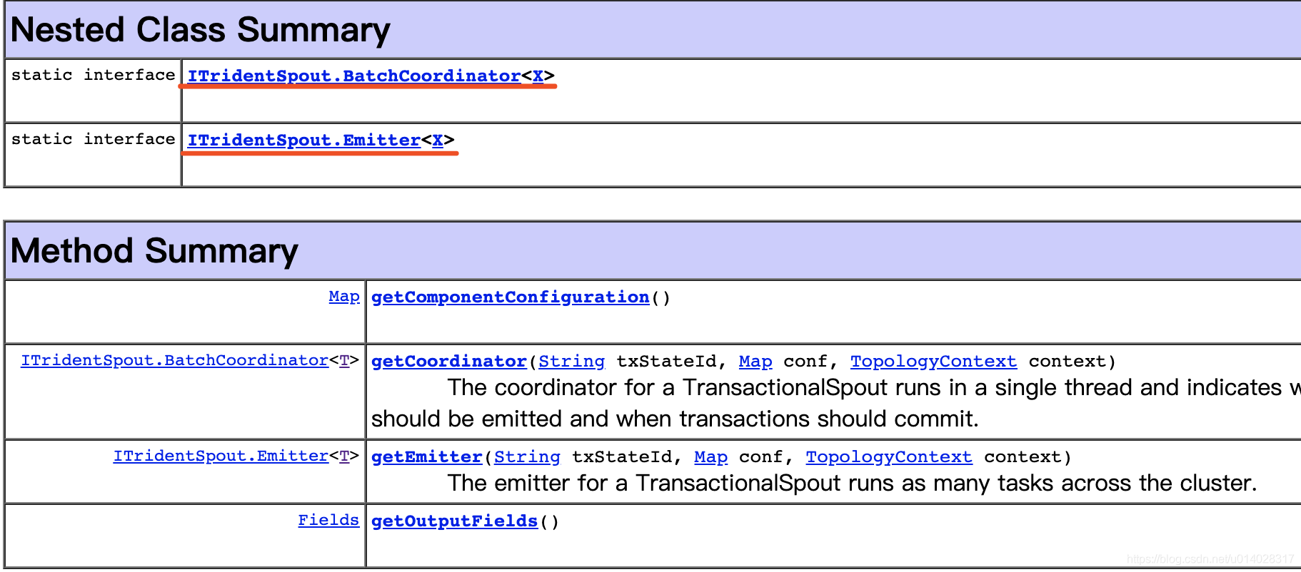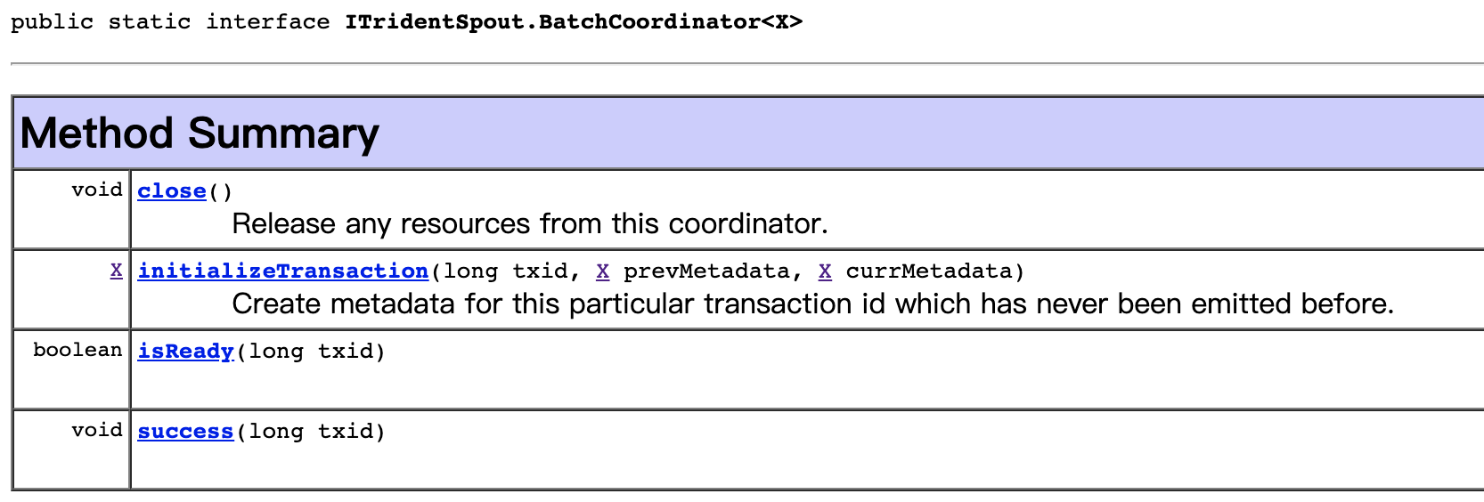 (1)ITridentSpout<T> 接口类,有2个内部接口类BatchCoordinator和Emitter,4个方法