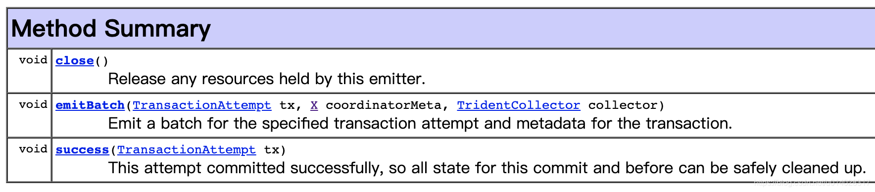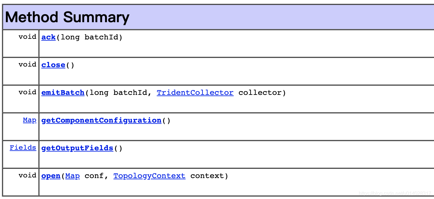 IBatchSpout接口,FixedBatchSpout类实现了IBatchSpout接口。IBatchSpout有6个方法;