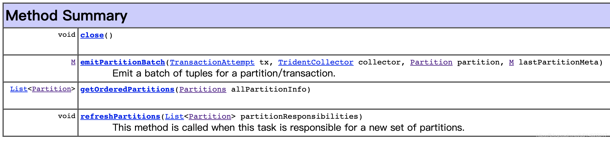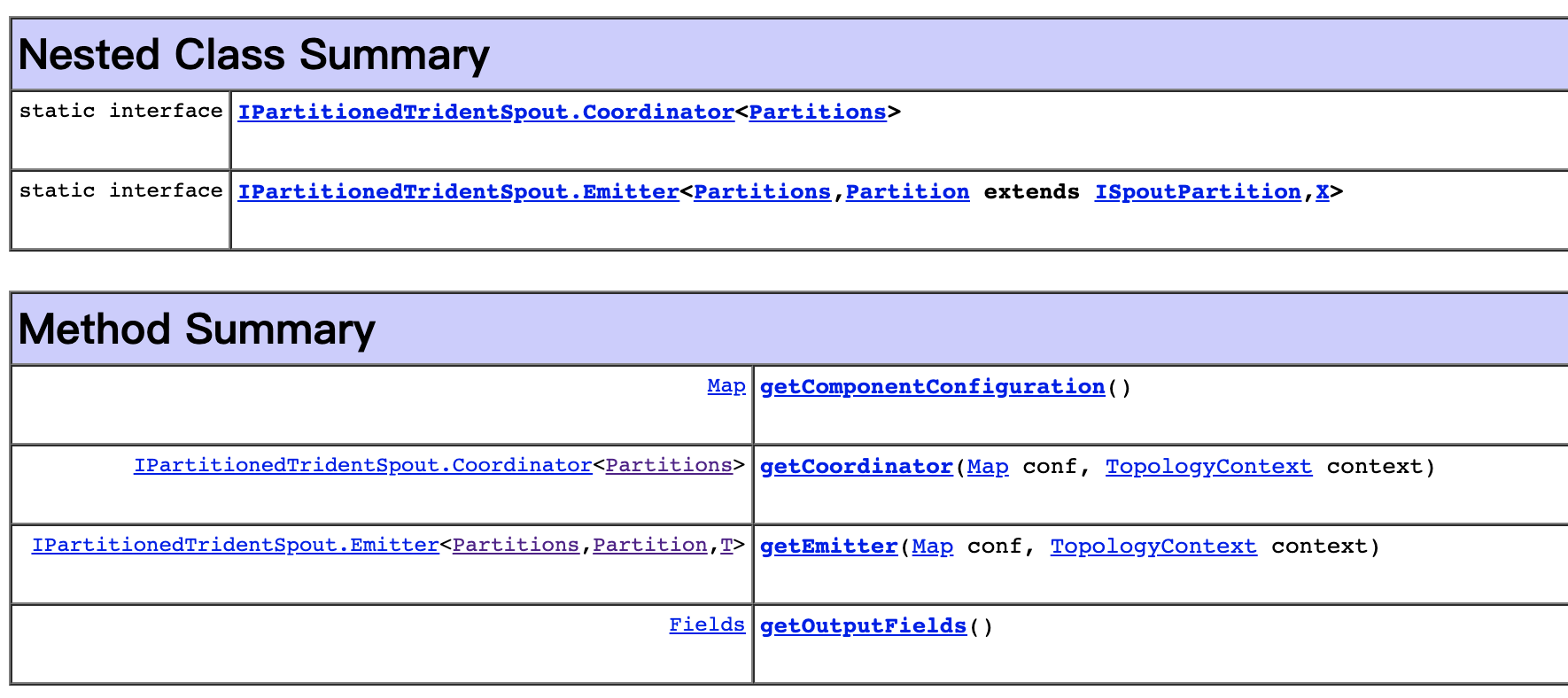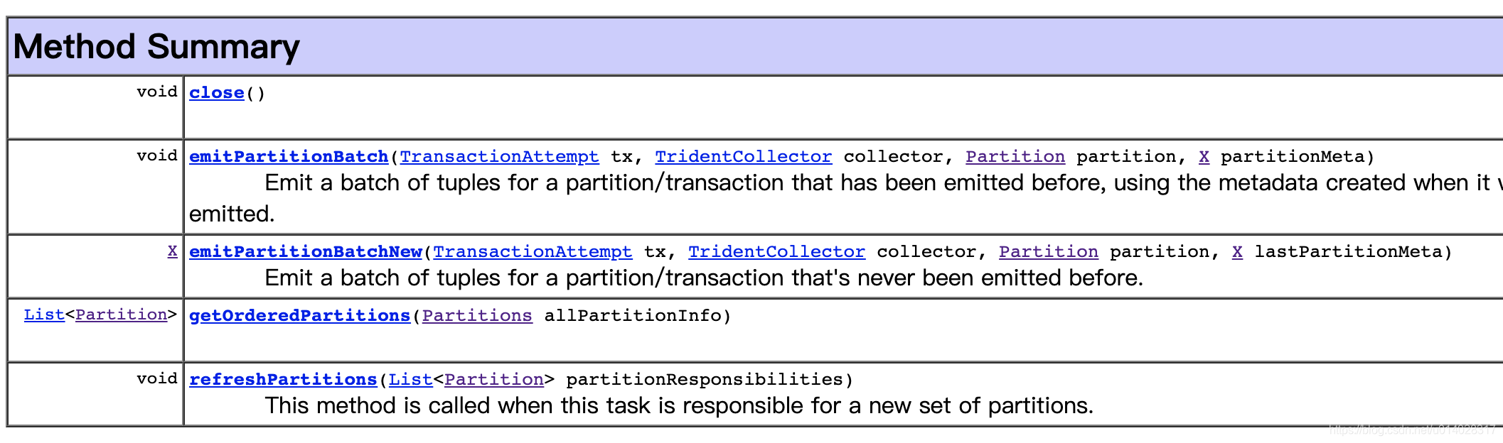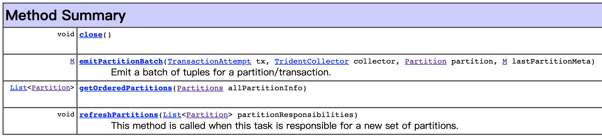 (1)IPartitionedTridentSpout<Partitions,Partition extends ISpoutPartition,T>,拥有2个类和4个方法