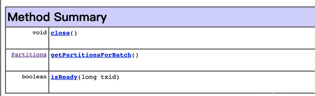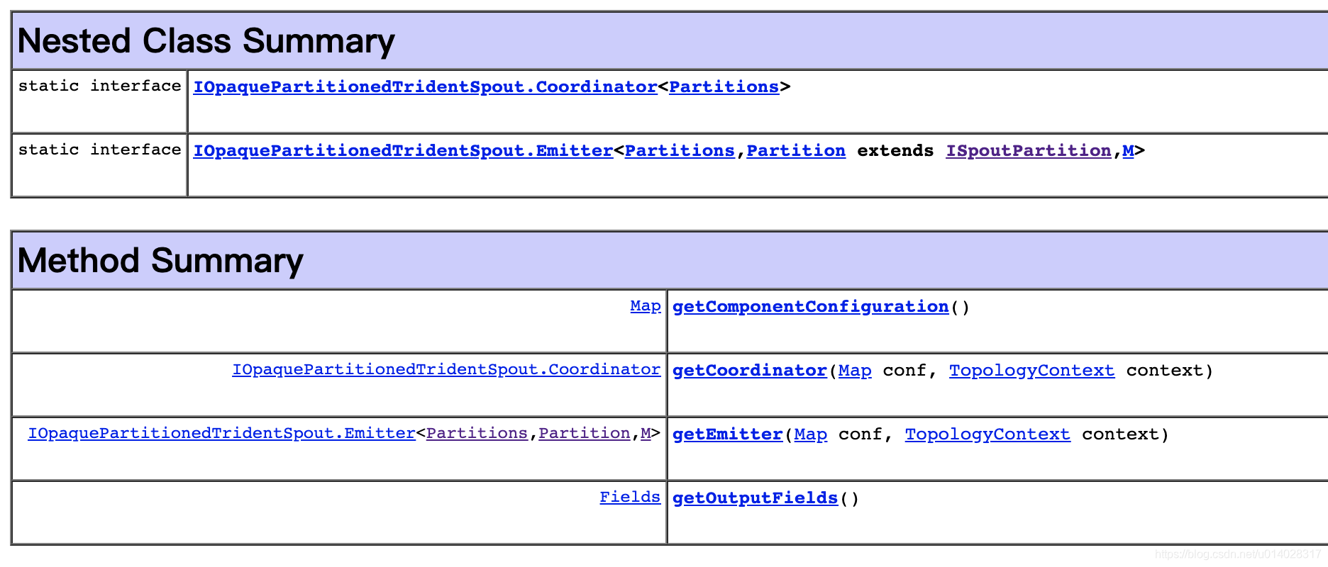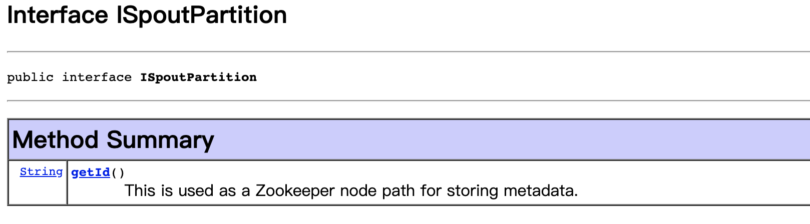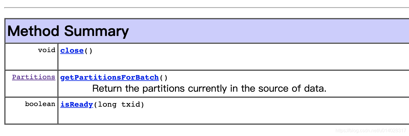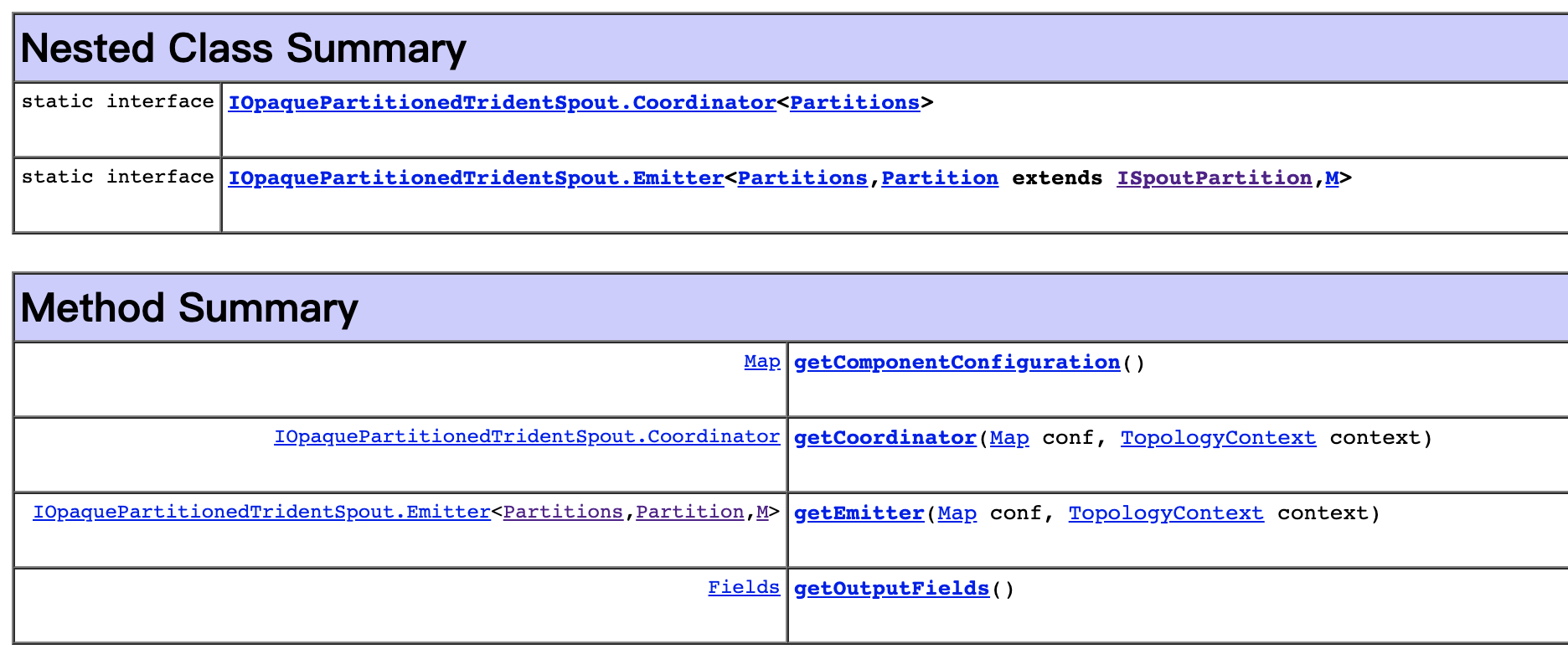 (1)IPartitionedTridentSpout<Partitions,Partition extends ISpoutPartition,T>,拥有2个类和4个方法