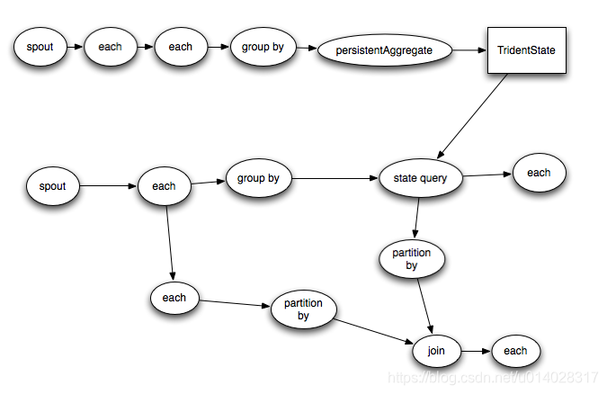 另一种合并流的方式是连接,类似于SQL那样的连接,要求输入是有限的。所以Trident的join只适用于来自Spout的每个小Bath之间。