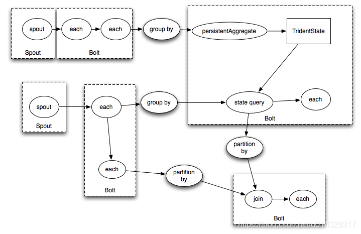 Trident API可以分为Spout操作和Bolt操作,对于Bolt操作提供常见的流数据分析操作。