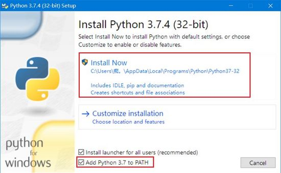注意: 勾选“Add Python 3.7 to PATH”