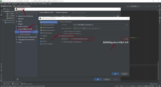对于pycharm IDE,你需要在setting中,选择python解释器(python的安装目录)