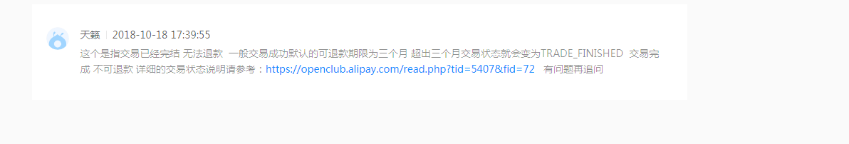 原来支付宝规定,交易成功后,默认退款时间三个月内没有退款,交易状态转为TRADE_FINISHED(交易完成)不可退款。