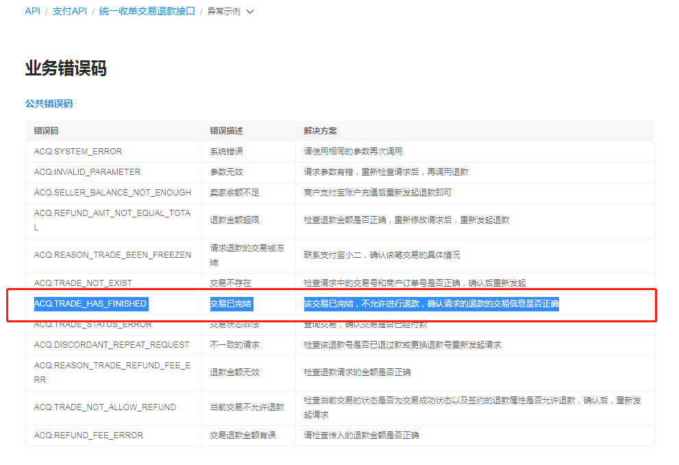 支付宝支付订单退款是提示【ACQ.TRADE_HAS_FINISHED】