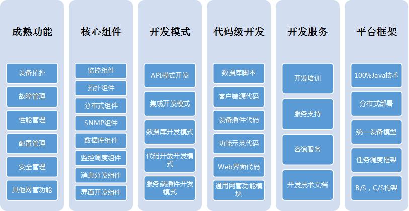 在此前景下,智和网管平台提出了平台化的概念,充分利用软件已有功能,提供多种开发模式和可拓展的框架模块供用户选择,简化复杂的网管基础技术研究。开发人员可以选择进行模块式或者代码式的开发形式,以便在最短的时间内满足用户各种定制需求,提高研发效率。
