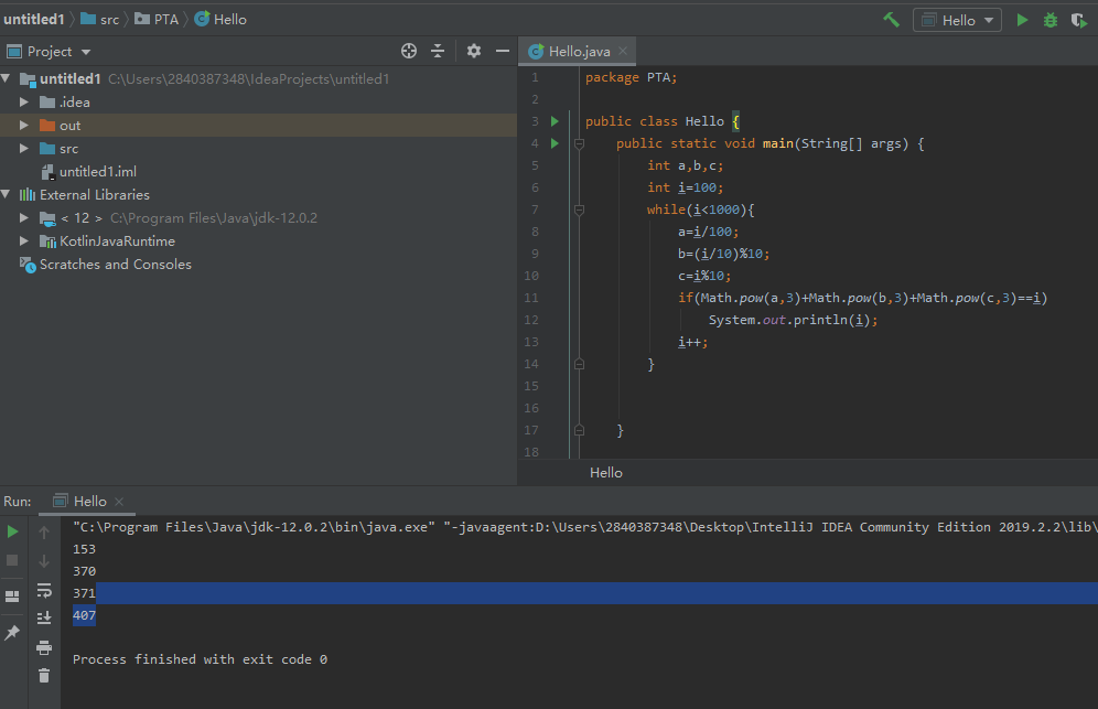 1.打印输出所有的“水仙花数”,所谓“水仙花数”是指一个3位数,其中各位数字立方和等于该数本身。例如,153是一个“水仙花数”。