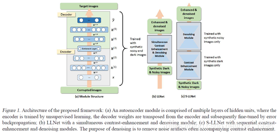 (2)探索了两种类型的网络结构:(a) LLNet,同时学习对比度增强和去噪;(b) S-LLNet,使用两个模块分阶段执行对比度增强和去噪。
