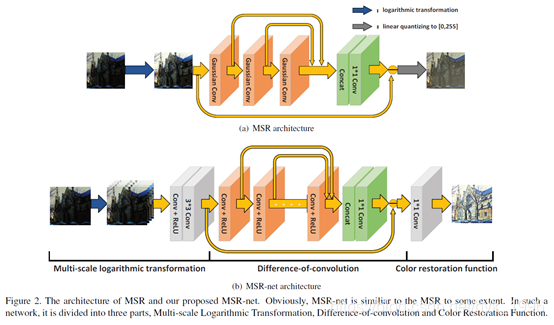 接着,仿照MSR的流程,他们提出了MSR-net,直接学习暗图像到亮图像的端到端映射。MSR-net包括三个模块:多尺度对数变换->卷积差分->颜色恢复,上面的结构图画得非常清楚了。