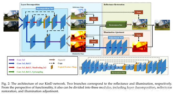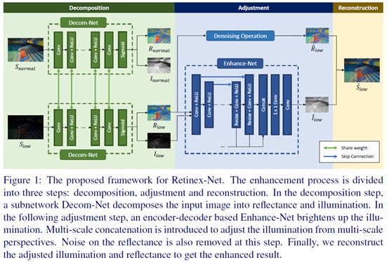 这篇文章的增强思路还是沿用了Retinex-Net的decomposition->enhance的两阶段方式,网络总共分为三个模块:Decomposition-Net、Restoration-Net和Adjustment-Net,分别执行图像分解、反射图恢复、光照图调整。一些创新点如下: