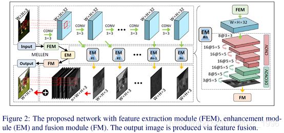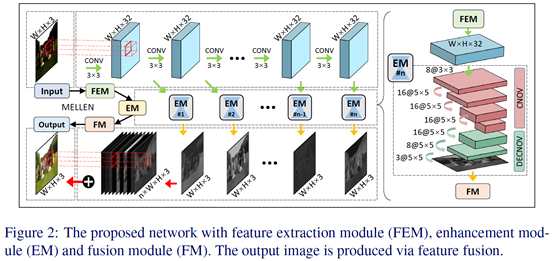 网络结构:包括特征提取模块FEM、增强模块EM和融合模块FM。FEM是有10层卷积的单流向网络,每层的输出都会被输入到各个EM子模块中分别提取层次特征。最终这些层次特征被拼接到一起并通过1x1卷积融合得到最终结果。为了用于视频增强,还需要对网络进行修改,具体可参考原文。