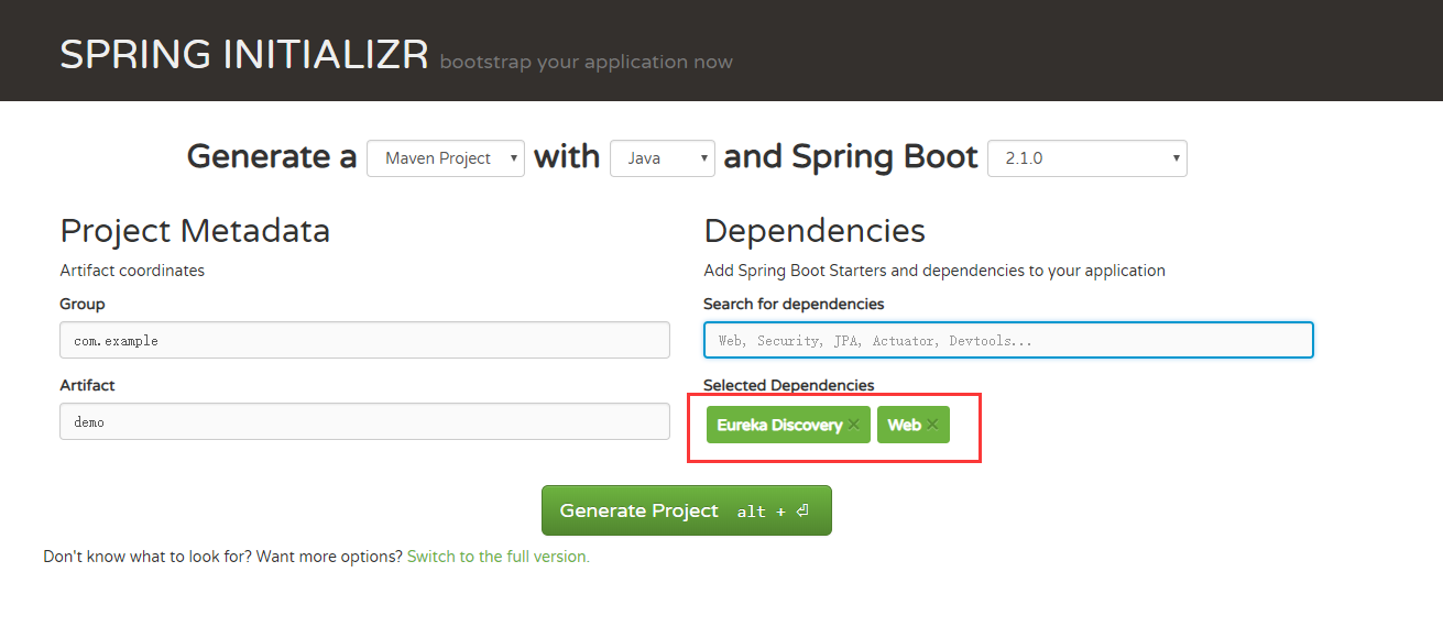 这一节,我们基于SpringBoot搭建一个服务的提供方,然后注册到上一节中我们搭建的Eureka注册中心。还是跟上一篇一样,去Spring的官网搜索对应的Eureka Discovery依赖,如下图:因为我们要用到restful接口,所以还要引入SpringBoot的web组件