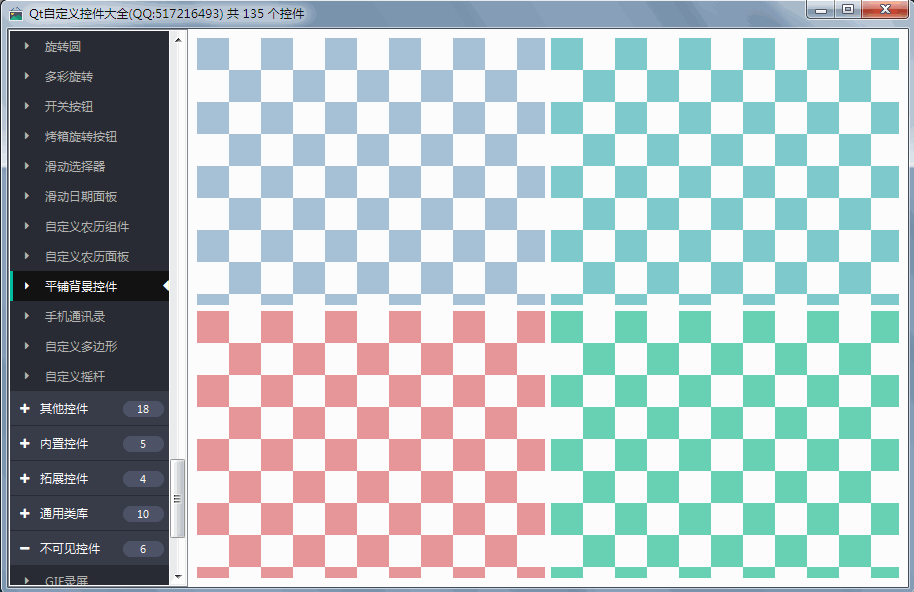 平铺背景控件,主要的应用场景是作为画布出现,黑白相间的背景图,然后上面可以放置图片图形等,使得看起来更美观,比如PS软件新建图层以后的背景,FireWorks软件新建画布以后的透明背景,ICO制作软件新建画布以后的背景,都会采用一个黑白相间的背景。尽管本人用QPainter很多年,后面在翻阅QPainter自带的函数中才发现居然QPainter自带了这个绘制平铺背景的函数,擦,他么叫drawTiledPixmap,Qt不愧是跨平台GUI开发中的佼佼者,这些东西居然都考虑到了,说到考虑的周到,Qt中连size和count和length都完美的封装了,适合不同人群的使用习惯,这个考虑也是非常周到的。drawTiledPixmap就两个参数,第一个参数是要绘制的区域,第二个参数是要绘制的图片,图片不足会自动拷贝填充,所以如果提供的是两个交替颜色的背景图片,就会依次绘制形成平铺背景的效果,为了使得颜色可以控制,本控件增加了交替颜色的设置,可以自行传入两种颜色作为交替颜色,在程序内部自动生成要绘制的图片。