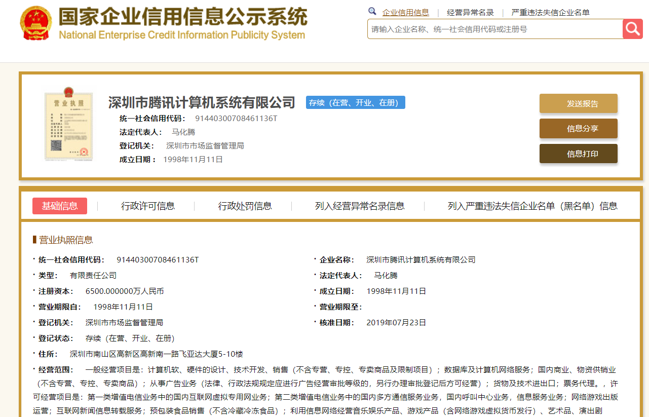 - 输入企业信息点击查询,这里以深圳市腾讯计算机系统有限公司为例